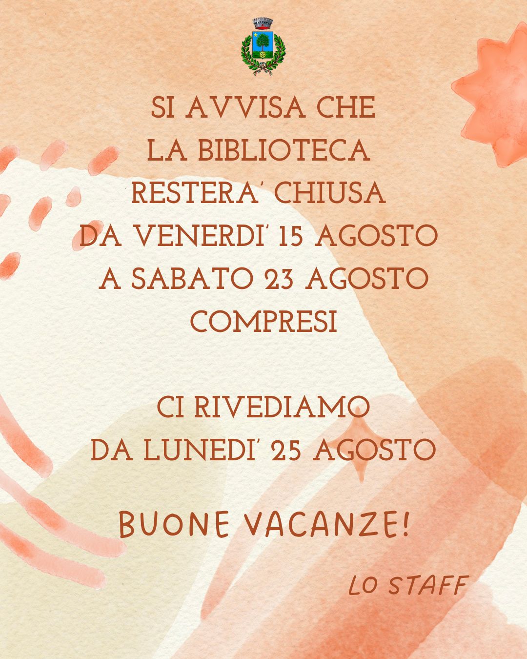 Descrizione Si avvisa che la biblioteca resterà chiusa da venerdì 15 agosto a sabato 23 agosto compresi. Il servizio riprenderà lunedì 25 al 30 agosto ancora con gli orari estivi.