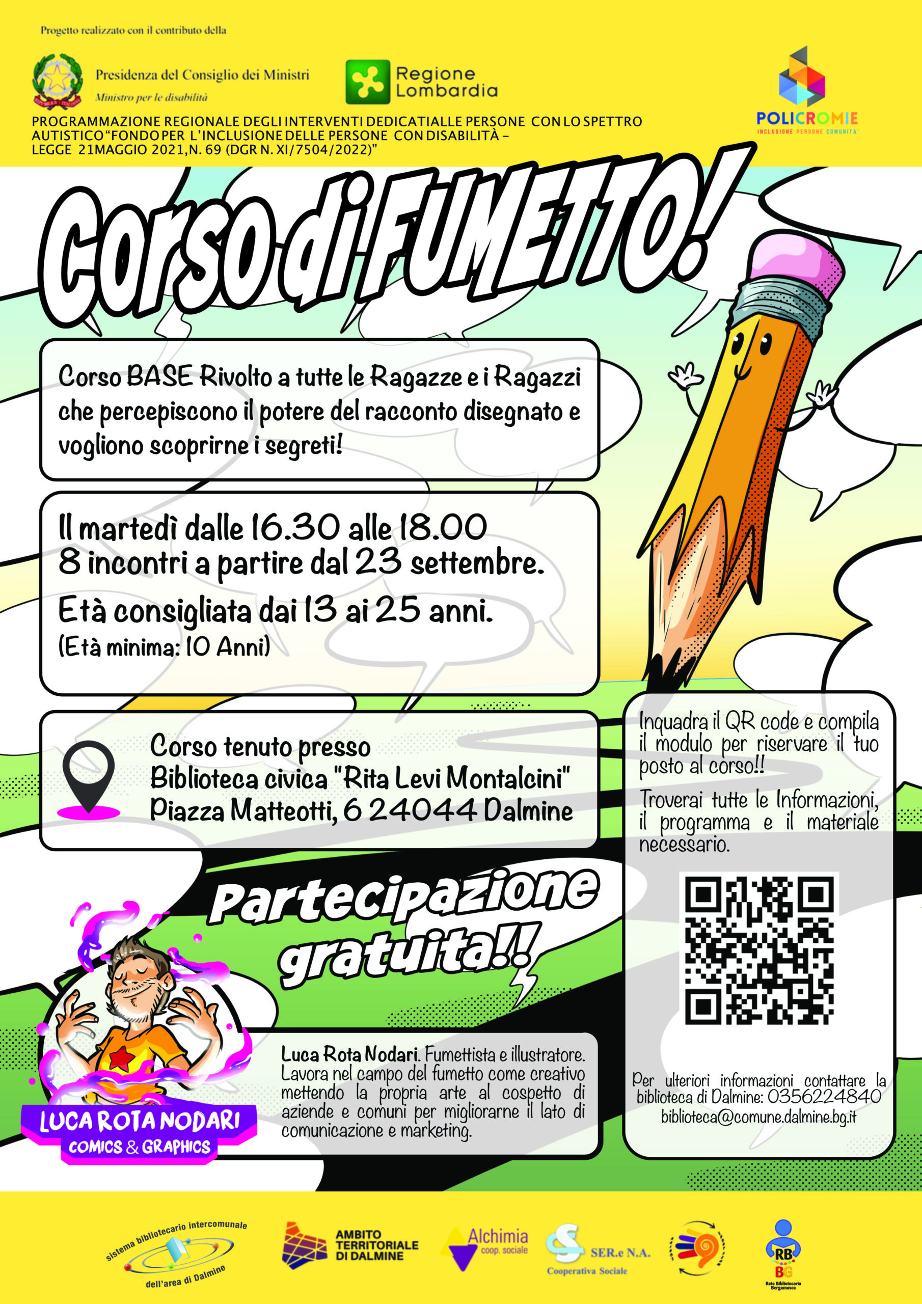Si informa che dal 23 settembre presso la biblioteca di Dalmine prenderà avvio la quarta e ultima edizione del corso di fumetto, organizzato attraverso la linea E “Tempo libero” del progetto Policromie, in collaborazione con la rete bibliotecaria di Dalmine.