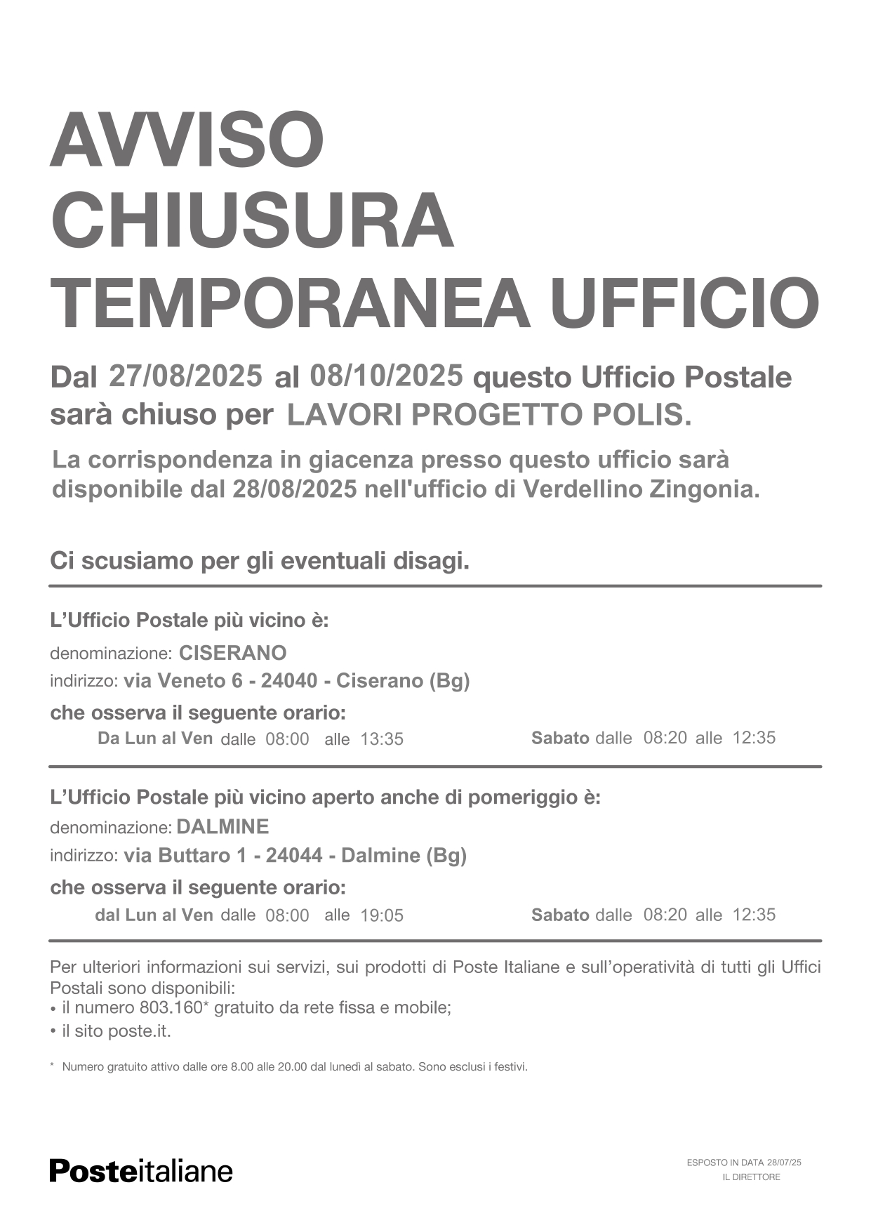 Descrizione Si comunica che l’Ufficio Postale sito in Via Magellano 1 sarà interessato dalla CHIUSURA AL PUBBLICO dal 27 agosto 2025 al 08 ottobre 2025 per lavori propedeutici al Progetto POLIS.